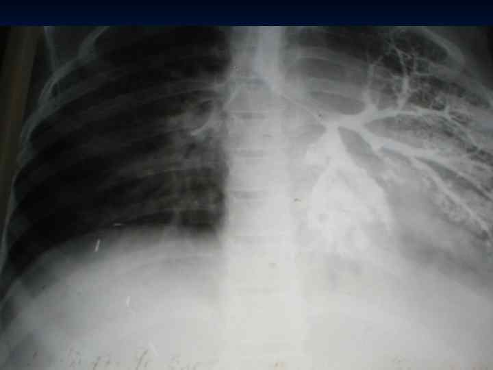 Рентгенология n Вздутие пораженных отделов легкого с медиастинальной грыжей, органы средостения смещены в здоровую сторону. n Бронхография выявляет (суб и компенсированные формы) – сужение и деформация долевого бронха и обрыв мелких бронхов со смещением ветвей сдавленных отделов легкого. Бронхи коллабированных долей легкого сближены и собраны в «метелку»