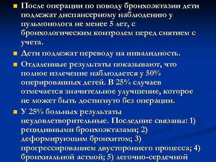 n После операции по поводу бронхоэктазии дети подлежат диспансерному наблюдению у пульмонолога не менее 5 лет, с бронхологическим контролем перед снятием с учета. n Дети подлежат переводу на инвалидность. n Отдаленные результаты показывают, что полное излечение наблюдается у 50% оперированных детей. В 25% случаев отмечается значительное улучшение, которое не может быть достигнуто без операции. n У 25% больных результаты неудовлетворительные. Последние связаны: 1) рецидивными бронхоэктазами; 2) деформирующим бронхитом; 3) прогрессированием двустороннего процесса; 4) бронхиальной астмой; 5) легочно-сердечной