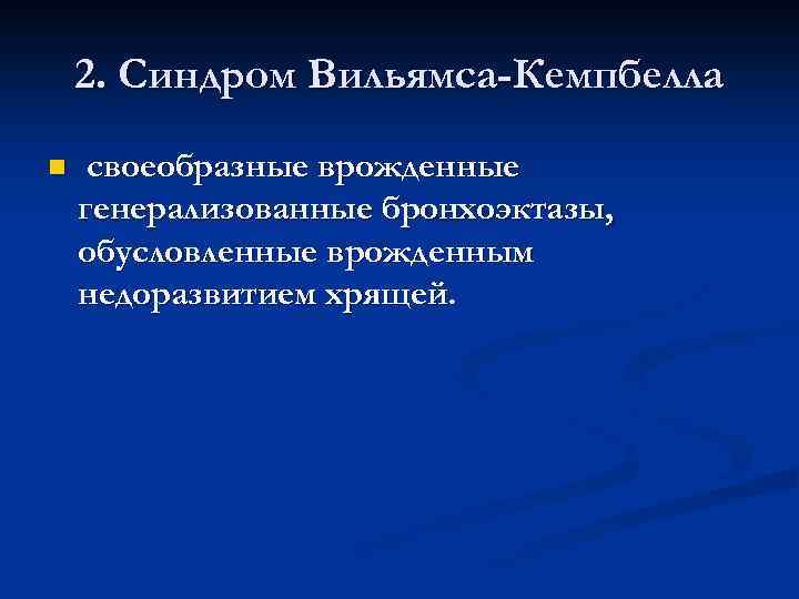 2. Синдром Вильямса-Кемпбелла n своеобразные врожденные генерализованные бронхоэктазы, обусловленные врожденным недоразвитием хрящей.