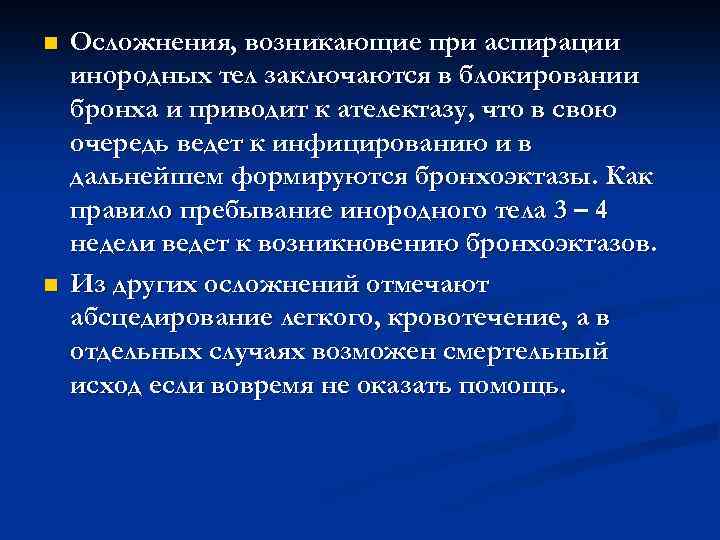 n Осложнения, возникающие при аспирации инородных тел заключаются в блокировании бронха и приводит к ателектазу, что в свою очередь ведет к инфицированию и в дальнейшем формируются бронхоэктазы. Как правило пребывание инородного тела 3 – 4 недели ведет к возникновению бронхоэктазов. n Из других осложнений отмечают абсцедирование легкого, кровотечение, а в отдельных случаях возможен смертельный исход если вовремя не оказать помощь.