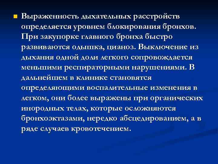 n Выраженность дыхательных расстройств определяется уровнем блокирования бронхов. При закупорке главного бронха быстро развиваются одышка, цианоз. Выключение из дыхания одной доли легкого сопровождается меньшими респираторными нарушениями. В дальнейшем в клинике становятся определяющими воспалительные изменения в легком, они более выражены при органических инородных телах, которые осложняются бронхоэктазами, нередко абсцедированием, а в ряде случаев кровотечением.