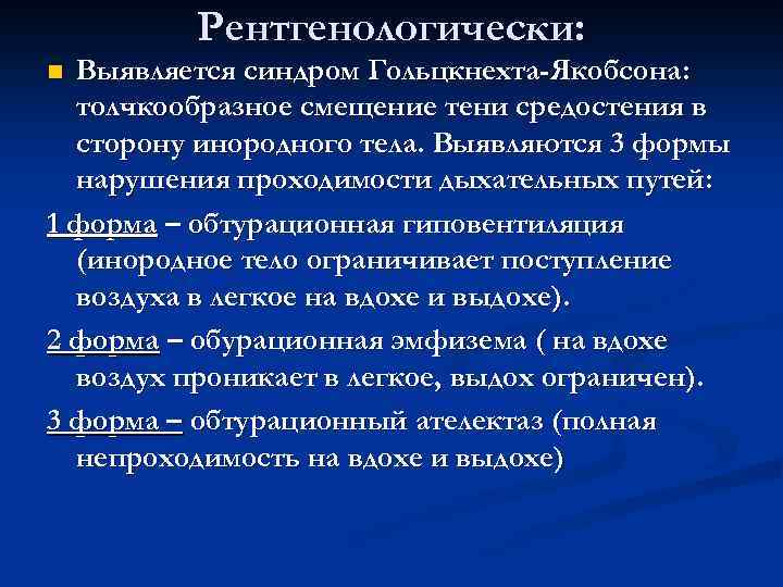 Рентгенологически: n Выявляется синдром Гольцкнехта-Якобсона: толчкообразное смещение тени средостения в сторону инородного тела. Выявляются 3 формы нарушения проходимости дыхательных путей: 1 форма – обтурационная гиповентиляция (инородное тело ограничивает поступление воздуха в легкое на вдохе и выдохе). 2 форма – обурационная эмфизема ( на вдохе воздух проникает в легкое, выдох ограничен). 3 форма – обтурационный ателектаз (полная непроходимость на вдохе и выдохе)