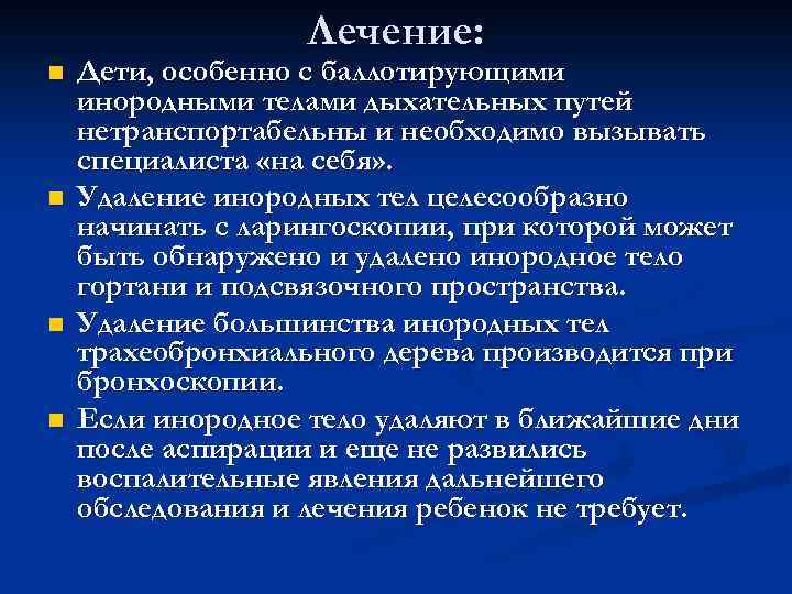 Лечение: n Дети, особенно с баллотирующими инородными телами дыхательных путей нетранспортабельны и необходимо вызывать специалиста «на себя» . n Удаление инородных тел целесообразно начинать с ларингоскопии, при которой может быть обнаружено и удалено инородное тело гортани и подсвязочного пространства. n Удаление большинства инородных тел трахеобронхиального дерева производится при бронхоскопии. n Если инородное тело удаляют в ближайшие дни после аспирации и еще не развились воспалительные явления дальнейшего обследования и лечения ребенок не требует.