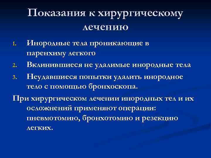 Показания к хирургическому лечению 1. Инородные тела проникающие в паренхиму легкого 2. Вклинившиеся не удалимые инородные тела 3. Неудавшиеся попытки удалить инородное тело с помощью бронхоскопа. При хирургическом лечении инородных тел и их осложнений применяют операции: пневмотомию, бронхотомию и резекцию легких.
