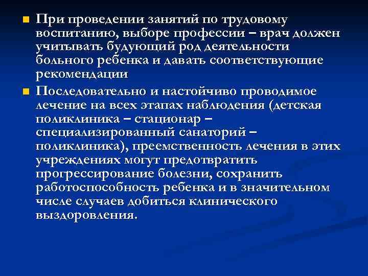 n При проведении занятий по трудовому воспитанию, выборе профессии – врач должен учитывать будующий род деятельности больного ребенка и давать соответствующие рекомендации n Последовательно и настойчиво проводимое лечение на всех этапах наблюдения (детская поликлиника – стационар – специализированный санаторий – поликлиника), преемственность лечения в этих учреждениях могут предотвратить прогрессирование болезни, сохранить работоспособность ребенка и в значительном числе случаев добиться клинического выздоровления.