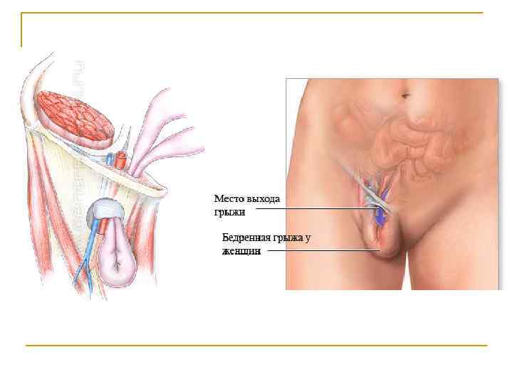 Бедренные грыжи n n Располагаются ниже пупартовой складки, выходят через бедренный канал кнутри от бедренной вены. Бедренные грыжи всегда приобретённые. Чаще встречаются у женщин