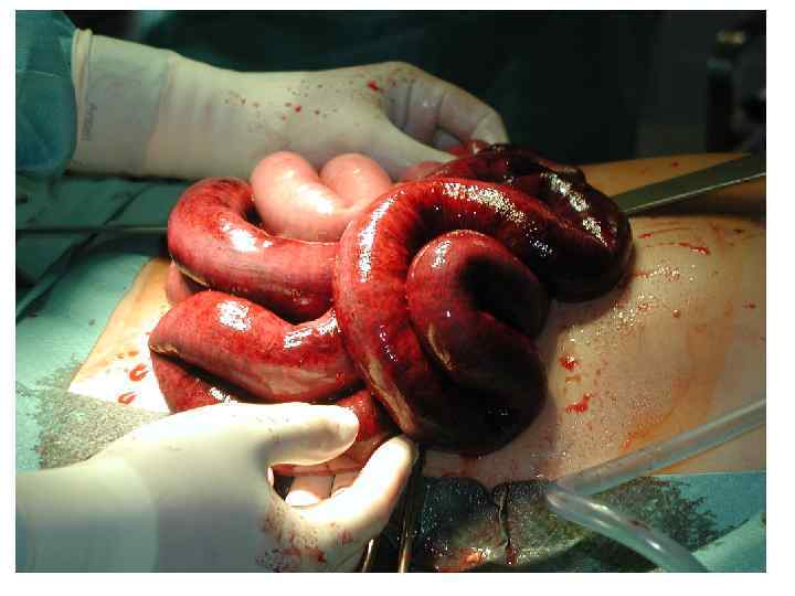 Объём оперативного вмешательства n n Определяется причиной, вызвавшей ОКН, уровнем непроходимости, жизнеспособностью кишки Жизнеспособность кишки оценивается по её цвету, пульсации брыжеечных артерий, наличию перистальтики, состоянию серозной оболочки (при ОКН она тусклая, матовая, отёчная)
