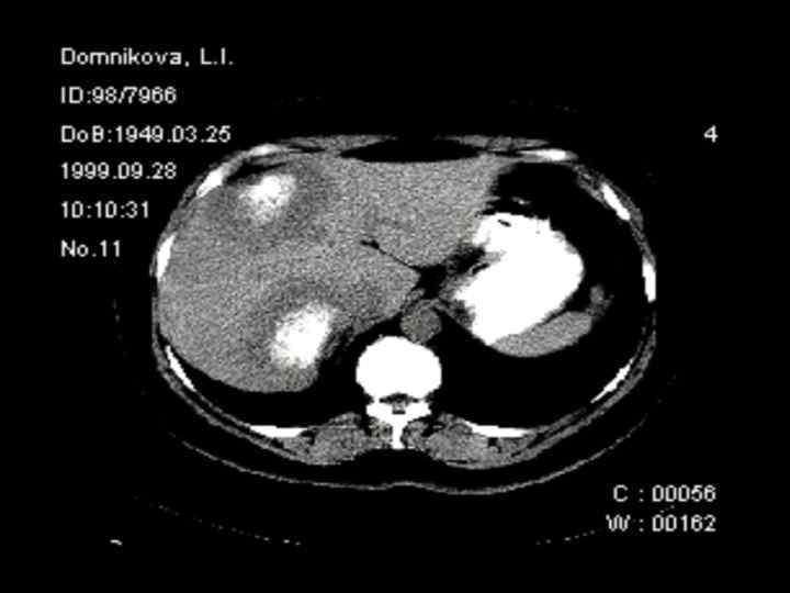 Диагностические задачи 1. Являются ли выявленные изменения опухолью? 2. Какова природа опухоли: доброкачественная или злокачественная? 3. Точное указание пораженной доли печени. 4. Точное указание пораженного сегмента печени. 5. Имеется ли поражение ворот печени? 6. Инвазия в окружающие печень структуры. 7. Имеются ли внепеченочные метастазы?