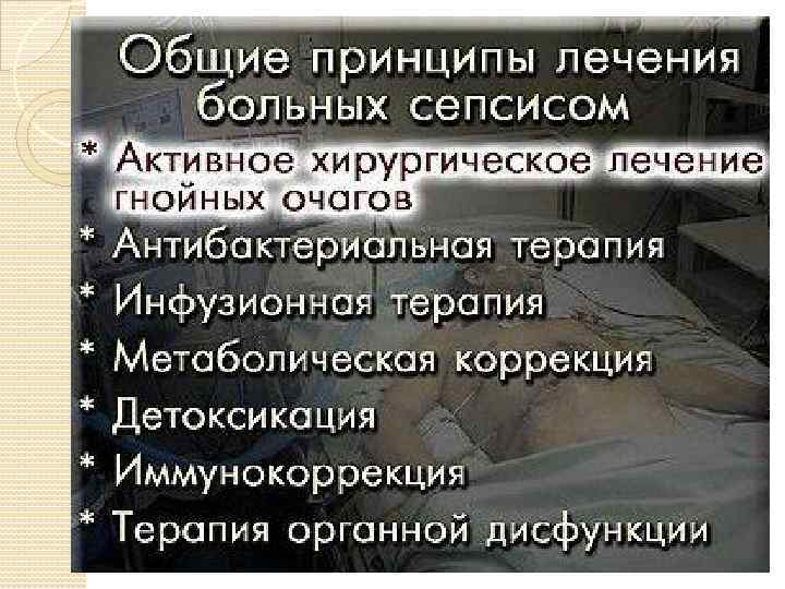Санация очага инфекции Антибиотикотерапия (в/в 7 -10 дней) Иммунокоррекция (полиглобулин, пентаглобин, интраглобулин, ронлейкин, антистафилококковая плазма) Восстановление тканевой перфузии (декстраны, плазмозаменители, гепарин, допамин) Глюкокортикоиды (60 -120 мг) Антиоксиданты (витамин С, токоферол) Детоксикационная терапия (УФОК, ГБО, лазеротерапия, плазмоферез, энтеросорбция) Ингибиторы ферментов (трасилол, контрикал, гордокс) Контаминационная терапия (дифлюкан, амфотерицин В)