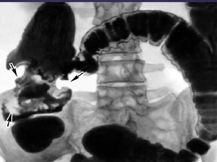 а) Он екі елі ішек стенозы. Ішектің түйілуі түрлерінің рентгендік көрініс ерекшеліктері б) Ащы ішектің жоғарғы бөлігінің түйілуі. в) Ащы ішектің төменгі бөлігінің түйілуі. г) Тоқ ішектің түйілуі. 1 - Қарынның ауамен толуы. 2 - Ащы ішектің желмен толуы (Клойбер симптомы). 3 – Сұйық. 4 - "Аркада ". 5 - Керкринг қатпарлары. 6 - Ауамен созылған соқыр ішек. 7 – Гаустрлар. 8 - Ішекті бітеген ісік. 9 - Ауамен созылған тоқ ішек. 10 - Тарылудан темен, ішінде