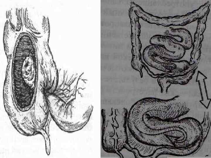 { Схематическое изображение инвагинации тонкой кишки в слепую — двойная инвагинация { Схематическое изображение инвагинации тонкой кишки в слепую — одиночная инвагинация Инвагинация