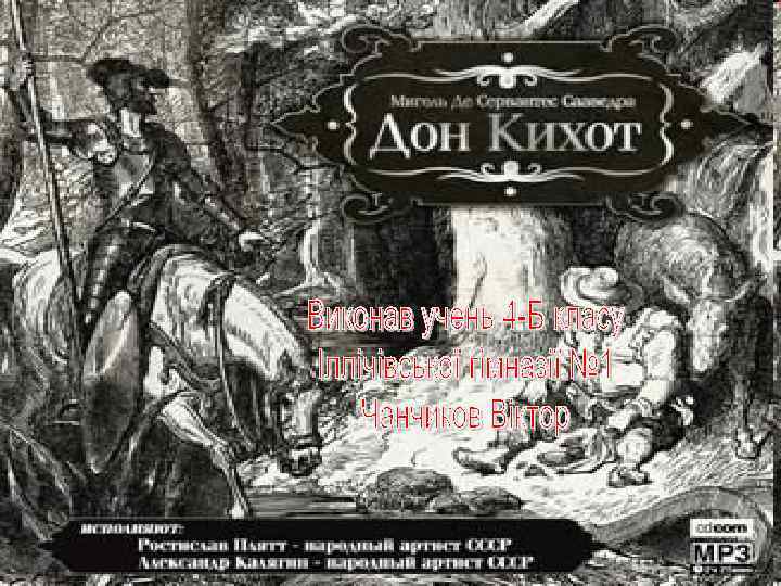 Лицарі минулого… Вони бентежать душі жіночої половини суспільства уже протягом кількох століть. Чи, може, то живе в наших душах туга за незнаною минувшиною, чи не вистачає сили і мужності в наших сучасниках. Юнакам же в обрисах попередніх епох увижаються лицарські турніри і славні звитяги. А славнозвісні кодекси честі! Чи й справді дотримувались їх воїни минулого, чи це тільки вигадка? Навіть якщо вигадка, то така, яку варто наслідувати. Недаремно ж епоху Відродження називають епохою титанів. Одним із них був бідний ґідальго Міґель Сервантес, який увіковічив себе багатством душі свого героя — лицаря сумного образу — Дон Кіхота. Ми майже нічого не знаємо про Дон Кіхота, крім того, що його майно складається з успадкованого давнього щита, списа, худої коняки та мисливського собаки. Як дворянин він має змогу бувати на полюванні. Ми дізнаємося, що героєві близько п’ятдесяти років, але не знаємо, звідки він родом, хто його батьки, чим займався досі. Але на наших очах герой перевтілюється у безрозсудного лицаря. Начитавшись лицарських романів, Алонсо Кіхано уявив себе одним із них, назвавшись Дон Кіхотом. Але йому до вподоби не лише лицарські пригоди, а висока мета боротьби зі злом. І тоді він намагається підкорити своїй вигадці повсякденність. Світ реальний витісняється світом фантастичним. Уйого уяві кобила стає бойовим конем, а сам він — бідний дворянин — мандрівним лицарем, захисником знедолених. Перша пригода Дон Кіхота виглядає дуже комічною, коли він веде бій з вітряками, вбачаючи в них велетнів. Іноді цей дорослий чоловік здається дитиною в своєму розумінні дійсності. Він вірить у людську порядність там, де її немає. В епізоді з побитим хлопчиком-пастушком Дон Кіхот, як і хлопчик, виглядає трагічним. Хлопчик — від побоїв багатія, який не платить йому грошей за роботу, Дон Кіхот — від своєї сліпої віри в людину.