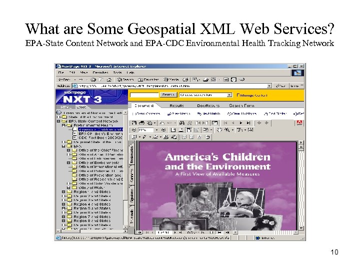 What are Some Geospatial XML Web Services? • Federal Spatial Statistics • EPA Geospatial Data Index • Interagency Land. View Census-EPA Population Estimation • EPA-State Content Network and EPA-CDC Environmental Health Tracking Network • Universal Access to Geo-referenced Web Content • “Blue Pages” Pilot 9