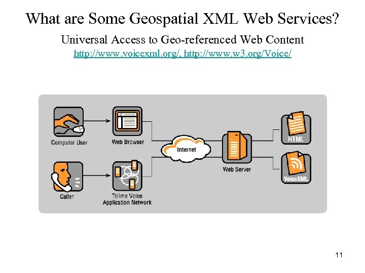 What are Some Geospatial XML Web Services? Universal Access to Geo-referenced Web Content http: //www. voicexml. org/, http: //www. w 3. org/Voice/ 11