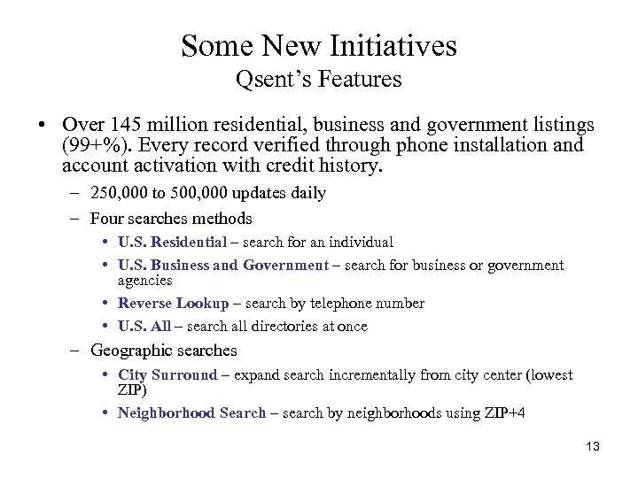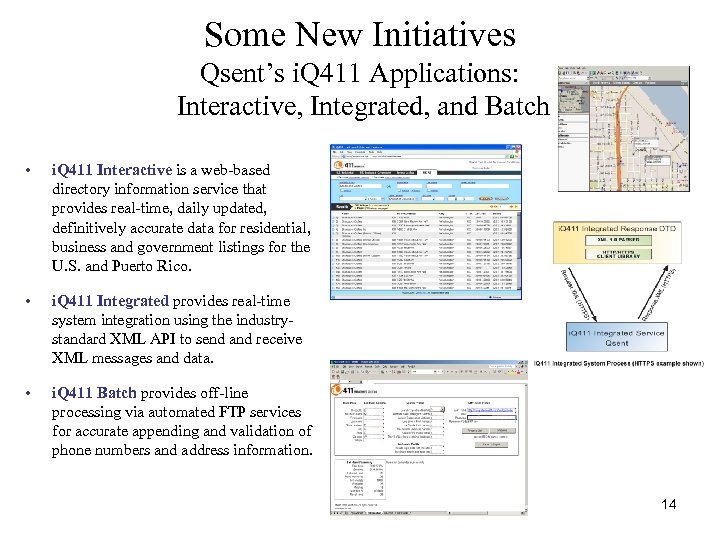 Some New Initiatives Qsent’s Features • Over 145 million residential, business and government listings (99+%). Every record verified through phone installation and account activation with credit history. – 250, 000 to 500, 000 updates daily – Four searches methods • U. S. Residential – search for an individual • U. S. Business and Government – search for business or government agencies • Reverse Lookup – search by telephone number • U. S. All – search all directories at once – Geographic searches • City Surround – expand search incrementally from city center (lowest ZIP) • Neighborhood Search – search by neighborhoods using ZIP+4 13