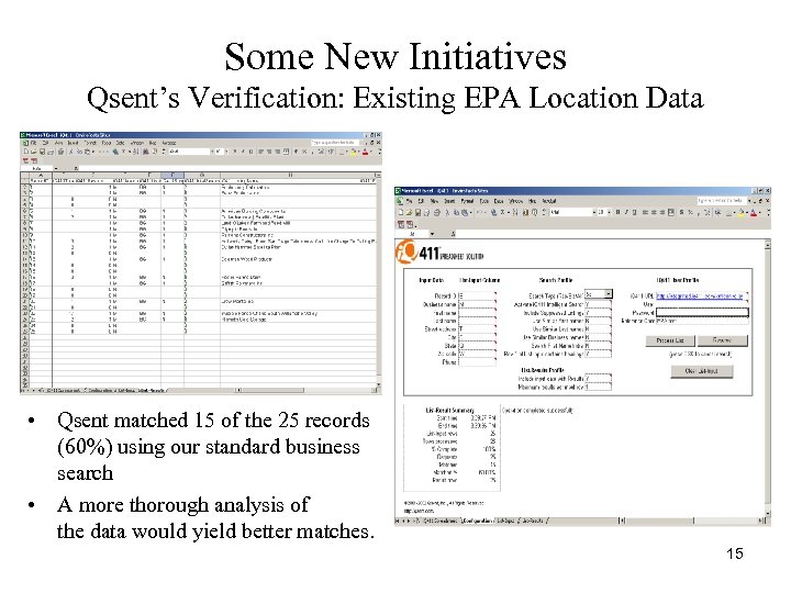 Some New Initiatives Qsent’s Verification: Existing EPA Location Data • Qsent matched 15 of the 25 records (60%) using our standard business search • A more thorough analysis of the data would yield better matches. 15