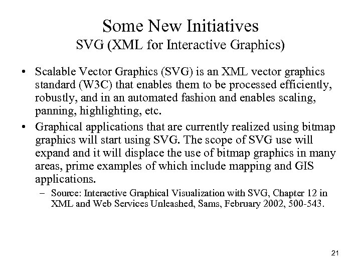 Some New Initiatives SVG (XML for Interactive Graphics) • Scalable Vector Graphics (SVG) is an XML vector graphics standard (W 3 C) that enables them to be processed efficiently, robustly, and in an automated fashion and enables scaling, panning, highlighting, etc. • Graphical applications that are currently realized using bitmap graphics will start using SVG. The scope of SVG use will expand it will displace the use of bitmap graphics in many areas, prime examples of which include mapping and GIS applications. – Source: Interactive Graphical Visualization with SVG, Chapter 12 in XML and Web Services Unleashed, Sams, February 2002, 500 -543. 21