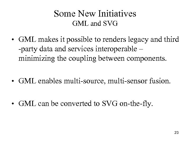 Some New Initiatives GML and SVG • GML makes it possible to renders legacy and third -party data and services interoperable – minimizing the coupling between components. • GML enables multi-source, multi-sensor fusion. • GML can be converted to SVG on-the-fly. 23