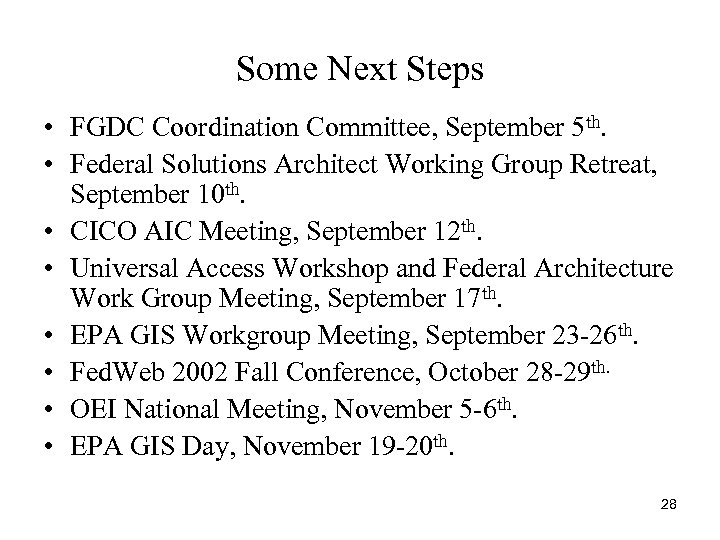 Some Next Steps • FGDC Coordination Committee, September 5 th. • Federal Solutions Architect Working Group Retreat, September 10 th. • CICO AIC Meeting, September 12 th. • Universal Access Workshop and Federal Architecture Work Group Meeting, September 17 th. • EPA GIS Workgroup Meeting, September 23 -26 th. • Fed. Web 2002 Fall Conference, October 28 -29 th. • OEI National Meeting, November 5 -6 th. • EPA GIS Day, November 19 -20 th. 28