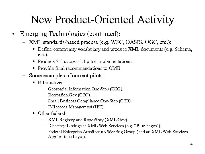 New Product-Oriented Activity • Emerging Technologies: – Area Leads: • • • XML – Owen Ambur (FWS) & Marion Royal (GSA) XML Web Services – Brand Niemann (EPA) Directory Services – Martin Smith (USITC) Universal Access – Susan Turnbull (GSA) PKI – Judy Spencer (GSA) – Tasks: • Evaluate technology and define strategy. • Foster pilot efforts and share best practices. • Transition to other organization for operational support. 3