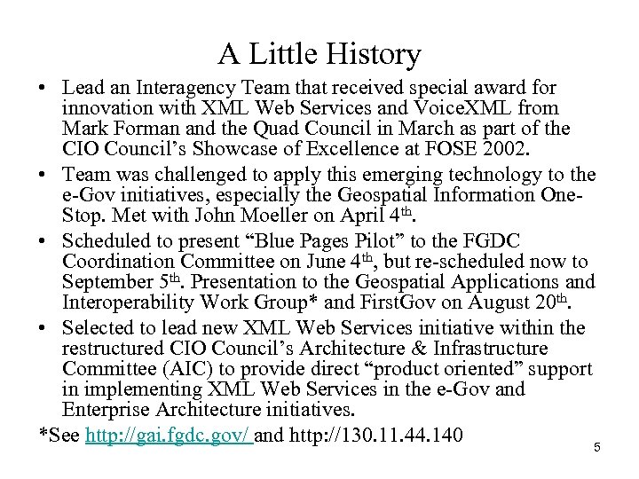 New Product-Oriented Activity • Emerging Technologies (continued): – XML standards-based process (e. g. W 3 C, OASIS, OGC, etc. ): • Define community vocabulary and produce XML documents (e. g. Schema, etc. ). • Produce 2 -3 successful pilot implementations. • Provide final recommendations to OMB. – Some examples of current pilots: • E-Initiatives: – – Geospatial Information One-Stop (G 2 G). Recreation. Gov (G 2 C). Small Business Compliance One-Stop (G 2 B). E-Records Management (IEE). • Other federal: – XML Registry and Repository (XML. Gov). – Directory Listings as XML Web Services (e. g. “Blue Pages”). – Federal Enterprise Architecture Working Group (add an XML Web Services Applications Layer). 4