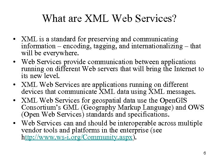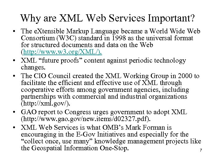 What are XML Web Services? • XML is a standard for preserving and communicating information – encoding, tagging, and internationalizing – that will be everywhere. • Web Services provide communication between applications running on different Web servers that will bring the Internet to its new level. • XML Web Services are applications running on different devices that communicate XML data using XML messages. • XML Web Services for geospatial data use the Open. GIS Consortium’s GML (Geography Markup Language) and OWS (Open Web Services) standards and specifications. • Web Services can and should be interoperable across multiple vendor tools and platforms in the enterprise (see http: //www. ws-i. org/Community. aspx). 6