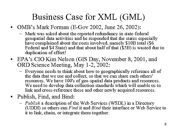 Why are XML Web Services Important? • The e. Xtensible Markup Language became a World Wide Web Consortium (W 3 C) standard in 1998 as the universal format for structured documents and data on the Web (http: //www. w 3. org/XML/). • XML “future proofs” content against periodic technology changes. • The CIO Council created the XML Working Group in 2000 to facilitate the efficient and effective use of XML through cooperative efforts among government agencies, including partnerships with commercial and industrial organizations (http: //xml. gov/). • GAO report to Congress urges government to adopt XML (http: //www. gao. gov/new. items/d 02327. pdf). • XML Web Services is what OMB’s Mark Forman is encouraging in the E-Gov Initiatives and especially for the “collect once, use many” knowledge management projects like the Geospatial Information One-Stop. 7