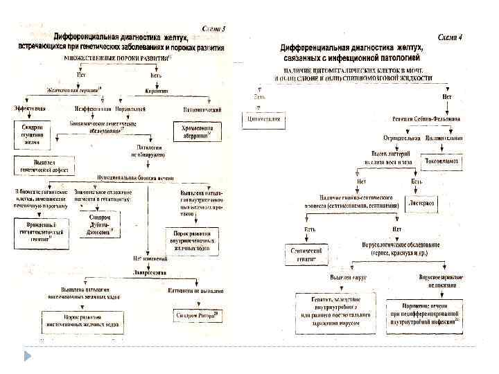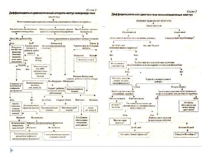 III. Желтухи с прямой гипербилирубинемией и с обесцвеченным стулом разной степени выраженности (холестатические желтухи); 1. Полная внутрипеченочная атрезия желчных путей (без или с гепатитом): а) нормальные внепеченочные желчные пути; б) гипоплазия внепеченочных желчных путей; в) полная внепеченочная атрезия желчных путей. 2 Полная внепеченочная атрезия желчных путей: а) нормальное количество внутрипеченочных желчных путей; б) пониженное количество внутрипеченочных желчных путей. 3 Гипоплазия внепеченочных желчевыводящих путей: а) нормальное количество внутрипеченочных желчных путей; б) пониженное количество внутрипеченочных желчных путей. 4 Гепатит без аномалий желчевыводящих путей. Синдром сгущения желчи (синдром "желчной пробки"), холелитиаз. Киста желчного протока или сдавление извне желчевыводящих путей. Муковисцидоз и дефицит альфа-1 -антитрипсина.