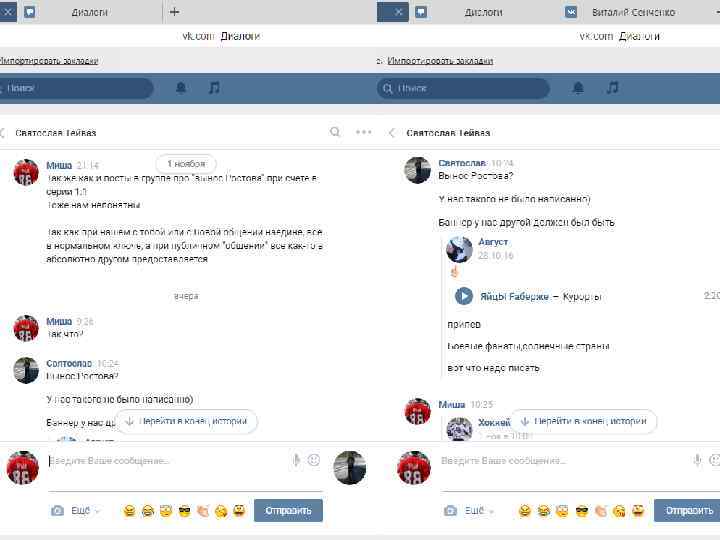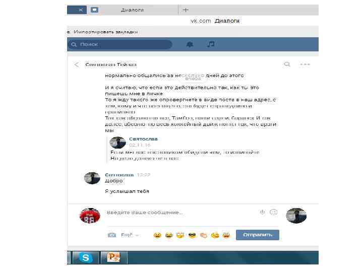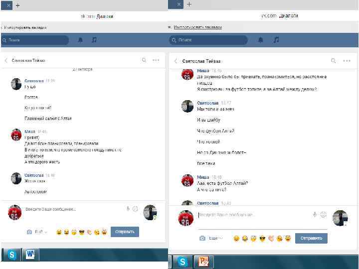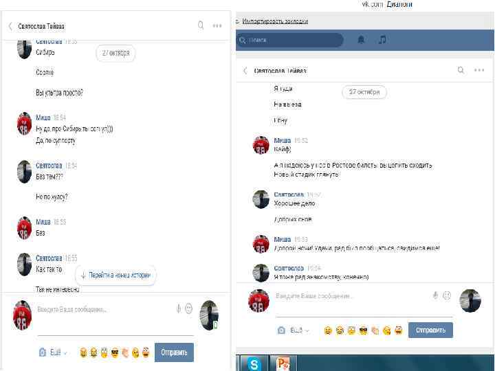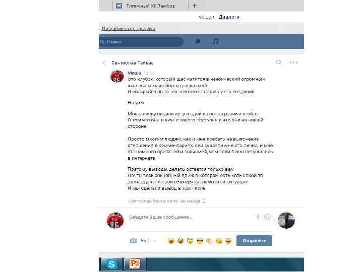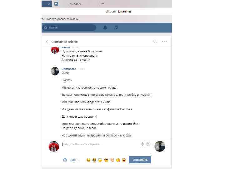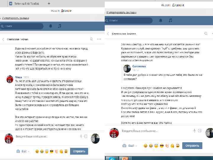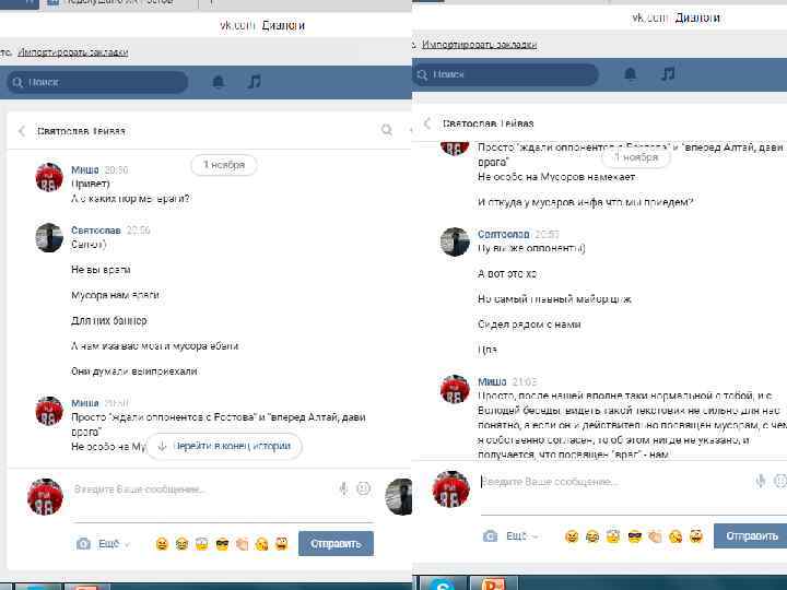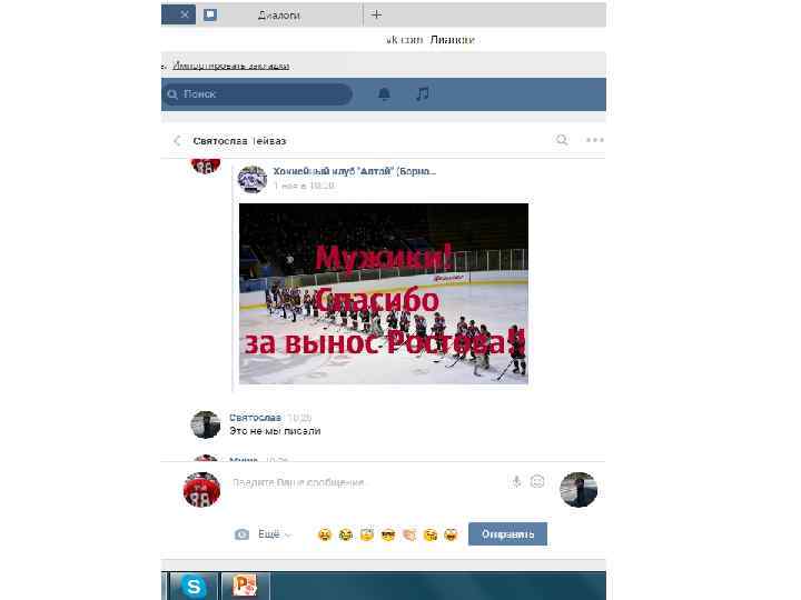 Хочу отметить, данная переписка (отрывками, где видно самое главное – момент знакомства и так далее) велась 27 октября, за 2 дня до выездных игр против Алтая. В ходе этих скриншотов видно, что знакомство прошло в нормальной атмосфере, без наездов с обоих сторон. Далее пойдут скриншоты с перепиской после игры с Алтаем, после появление записи в группе «ВХЛ УЛЬТРАС» и «ФАНАТЫ НИЗШИХ ЛИГ» , и после того как мы увидели тряпку и сам пост про что собственно и разгорелся срач. Так же хочется отметить, что автором этого поста является Святослав, и именно поэтому я продолжаю свой диалог именно со Святославом.
