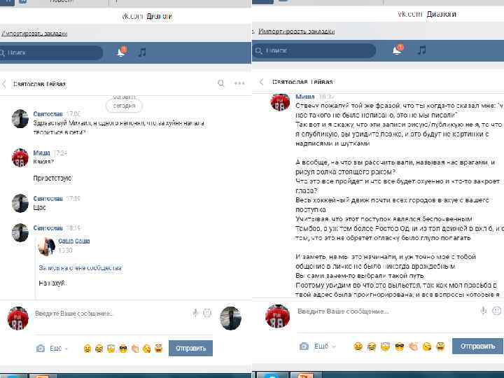 Миша 10: 35 Я не против ваших рамсов с серыми Смотри, перечислю то, за что я пытаюсь с тобой выяснить "Собрали свою суровую дружину ибо должны были приехать оппоненты из Ростова" "Вот матч, а оппонента нет" - это получается мы вам напиздели что приедем, а потом слились Хотя я тебе не говорил о приезде на этот матч, и говорил что нас не будет "Видите ли это оскорбляет команду из Ростова" - про друзей или хотя бы про тех, с кем нейтральные нормальные отношения так не говорят "Доебаться до матов из наших уст" - очевидно, что мат был не в адрес Мусоров, ибо если б вы их хуесосили, они б не доебывались, а принимали меры, следовательно мат в наш адрес, потому что когда мы хуесосили ХКЧ, то серые тоже нам ебали мозги за это, следовательно у вас была аналогичная ситуация, только мат в наш адрес, так же про то, был ли мат в наш или в адрес команды мы тоже узнаем и удостоверимся непосредственно от самих хоккеистов По факту написал? Твои слова в посте? И я не понимаю твое общение, когда мы с тобой общаемся в личке нормально все, а потом публично ты пишешь совершенно другие вещи, и на матче происходят совершенно другие вещи Ты как один из представителей и руководителей, и поэтому я с тобой и общаюсь, и щас ты получается публично нас выставил так, что мы пиздаболы должны были приехать но зассали И что мы враги И выставил все это напоказ, после того как мы с тобой нормально общались за несколько дней до этого И я считаю, что если это действительно так, как ты это пишешь мне в личке То я жду такого же опровергнете в виде поста в наш адрес, с тем, кому и что посвящено, это будет справедливо и правильно Так как абсолютно все, Тамбов, наши парни, Саранск И так далее, абсолютно весь хоккейный движ понял так, что враги - мы