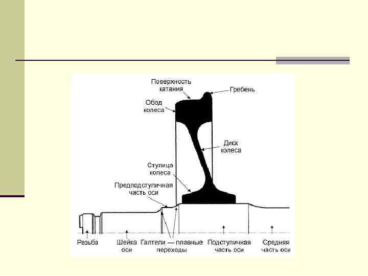 Колесная пара вагона Колесная пара и форма шейки оси: 1 - ось; 2 - колесо; 3 - буксовая шейка; 4 - предподступичная часть; 5 - подступичная часть; 6 - средняя часть; 7 - резьбовая часть