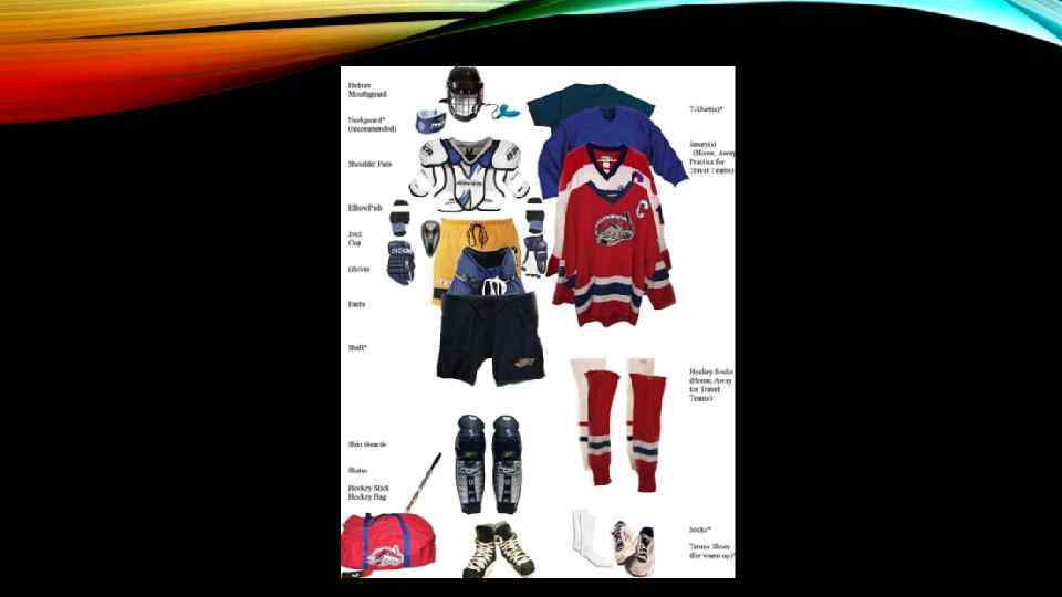 ЭКИПИРОВКА Экипировку полевого игрока составляют: клюшка, коньки, шлем, нагрудник, который защищает грудную клетку, позвоночник и плечи хоккеиста, налокотники, раковина, предназначенная для защиты паховой области от ударов шайбы и других травм, хоккейные шорты со специальными уплотнителями, предотвращающие травмы при падениях, столкновениях и ударах шайбы, защитные перчатки (краги), щитки, закрывающие колено и голень хоккеиста, и свитер, надеваемый поверх нагрудника. • Экипировка вратаря состоит из всех вышеописанных элементов, специальной вратарской маски и ловушки — перчатки, специально сконструированной для ловли шайбы, а также щитков для отражения бросков. • Клюшки изготовлены из дерева или другого материала, например, алюминия или пластика. • Шайба диаметром 7. 62 см должна быть изготовлена из вулканизированной резины или другого одобренного Международной федерацией хоккея на льду материала и быть, в основном, черного цвета