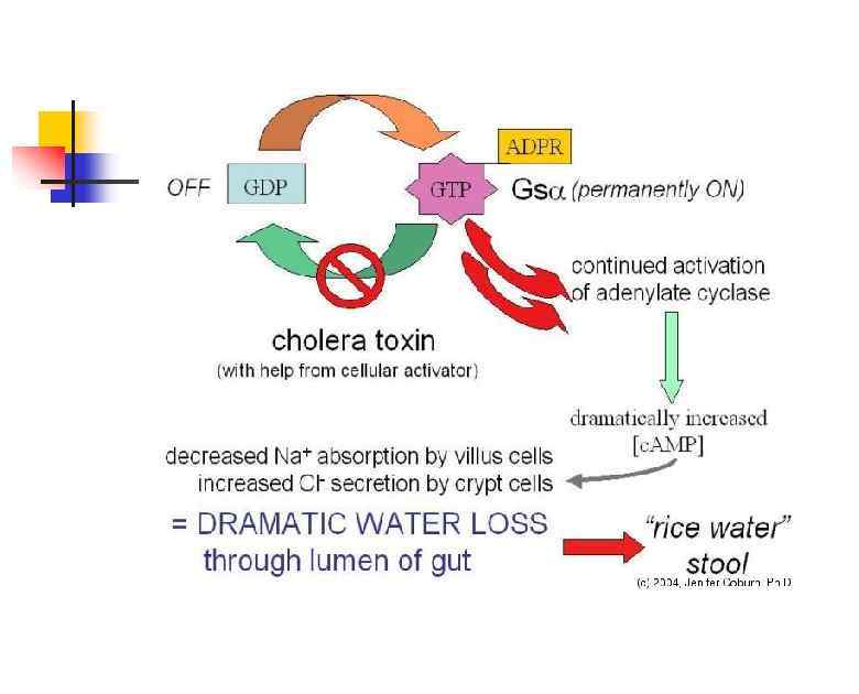 Термолабильный энтеротоксин В норме регуляция аденилатциклазы осуществляется регуляторным белком (Gs) и гуанозинтрифосфатом(GTP). А 1 субъединица холерного токсина Однако, активация подавляется прикрепляется к белку Gs с образованием регуляторным белком(Gi) и происходит комплекса (Gs-ADPR), и гидролиз ГТФ. становится невозможен. Поскольку гидролиз ГТФ является ключевым событием для инактивации аденилатциклазы, фермент остается в состоянии постоянной активации.