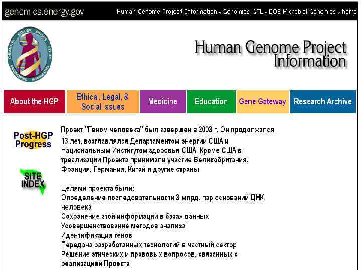 ПРОГРАММА «ГЕНОМ ЧЕЛОВЕКА» Целями проекта были: Идентифицировать все гены (примерно 20000 -25000 генов) генома человека Определить последовательность 3 млрд. пар нуклеотидов, составляющих геном Сохранить всю информацию в базах данных Усовершенствовать методы анализа данных Установить какие этические и социальные проблемы могут возникнуть в связи с Проектом