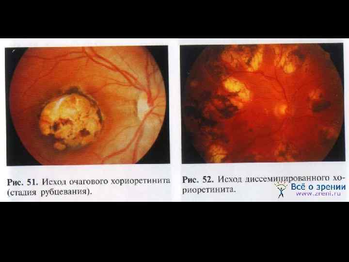 • На диске зрительного нерва может появиться экссудат, прикрывающи й сосудистую воронку и большую часть поверхности диска в виде сероватой шапки.