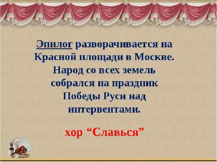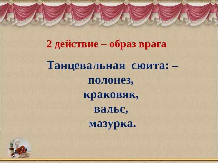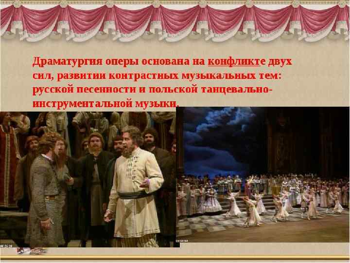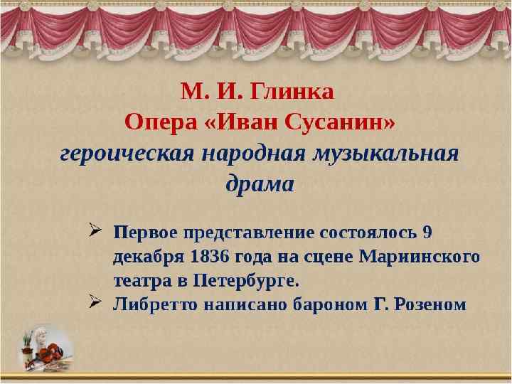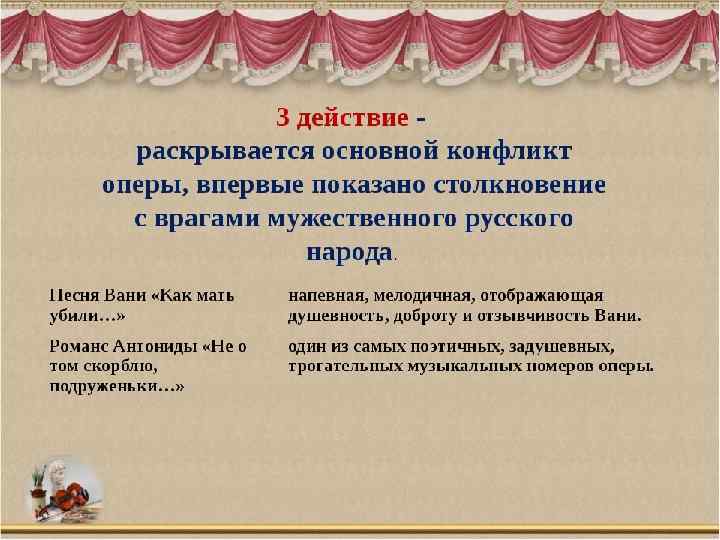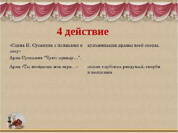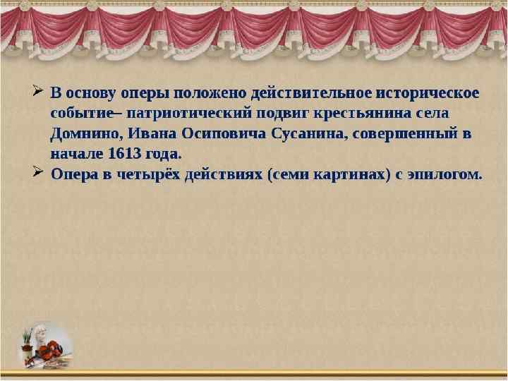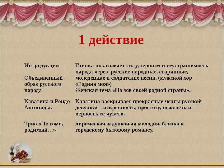 Действующие лица: Иван Сусанин – крестьянин села Домнина – бас; Антонида – дочь Ивана Сусанина – сопрано; Ваня – приемный сын Сусанина – контральто; Богдан Собинин – ополченец, жених Антониды – тенор; Русский воин – бас; Польский гонец – тенор; Сигизмунд, король Польский – бас; Хоры крестьян и крестьянок, ополченцев, балет польских панов