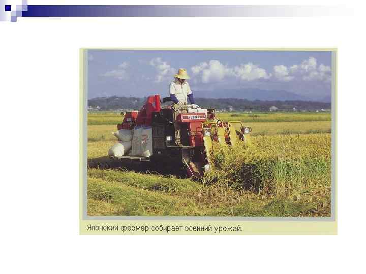 Сельское хозяйство. n n По специализации с/х Японии заметно отличается от других развитых стран: доля растениеводства превышает долю животноводства в два раза. Но несмотря на это, своего зерна стране не хватает , Япония вынуждена импортировать зерновые культуры от ближайших соседей: Китая, Кореи. О японской организации сельского хозяйства во всем мире знают как о довольно таки отсталой, это вызвано рядом причин: преобладание карликовых крестьянских хозяйств мелкотоварного типа, ограниченными капиталовложениями направляемыми на улучшение земель, слабостью агротехнической базы, кабальной задолженностью крестьян. За последнее время продуктивность земли несколько снизилась.