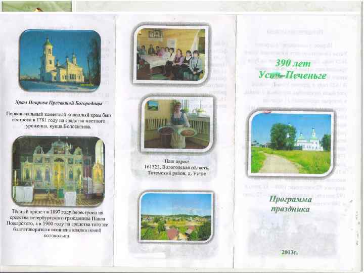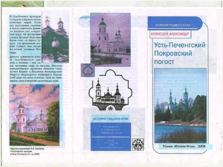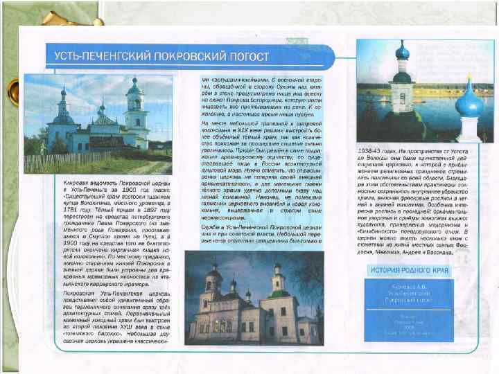 Текст для слайдов 1. Храм расположен в 17 км от г. Тотьмы (Российская Федерация, Вологодская область, в нынешнем с. Устье). Усть-Печеньга переводится как «сосновая река» , то есть река, берега которой поросли сосновым лесом. 2. Покровский храм действительно замечателен как по архитектуре, так и по истории. По описи 1623 года в Усть-Печеньге были храм (очевидно, деревянный) и шесть дворов, в них мужского полу 12 человек. Неизвестно, в честь какого святого или праздника был освящен этот храм, его история надолго теряется во мраке, и лишь из клировых ведомостей 1900 года мы узнаем, что ныне существующий храм построен тщанием купца Волокитина, местного уроженца, в 1781 году и освящен в честь Покрова Пресвятой Богородицы. 3. Текст на слайде. 5 С тех пор церковь достраивалась и перестраивалась. Новая колокольня в стиле эклектики построена в 1890 г. , в стиле эклектики решена и трапезная с двумя теплыми приделами. 6 - 15. Текст на слайде. 16. Достойно удивления, что храм этот не подвергался поруганию в годы советской власти — потомки тех самых двенадцати набожных мужиков храм свой отстояли. О тех временах ходит местная легенда о том, что тогдашний настоятель храма отец Философ учился вместе с Лениным, и, когда стали храмы закрывать, он написал в Москву — и в Усть-Печеньге храм оставили. Так или иначе, храм закрывался лишь с 1938 по 1943 годы, когда в нем было устроено зернохранилище, но и в этом случае народ не допустил разорения храма: всю утварь разобрали на хранение по домам, а заведующий зернохранилищем был человек верующий (добрая память о нем и сейчас жива среди прихожан) и не допустил повреждения храма. Поэтому, когда во время Великой Отечественной войны наступил момент перемирия между советской властью и Церковью, зерно из храма вывезли, утварь и иконы вернули, вот только батюшку осталось найти.