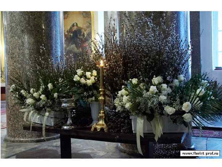 Очень красив храм в Вербное Воскресенье, когда народ приносит на освящение веточки вербы с цветами и свечами. В северных и центральных районах России это - пушистые шарики кустарниковой ивы (краснотал), на юге - побеги плакучей ивы вавилонской (иерусалимская верба). Украшая церковь в эти дни, хорошо ввести в декор вайи (пальма) или саговников (цикас). Ведь именно пальмовыми ветвями приветствовал народ Иисуса при въезде в Иерусалим.