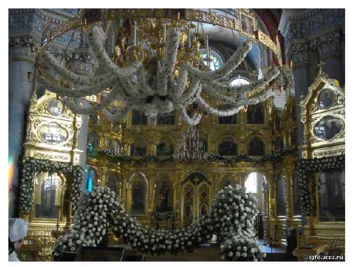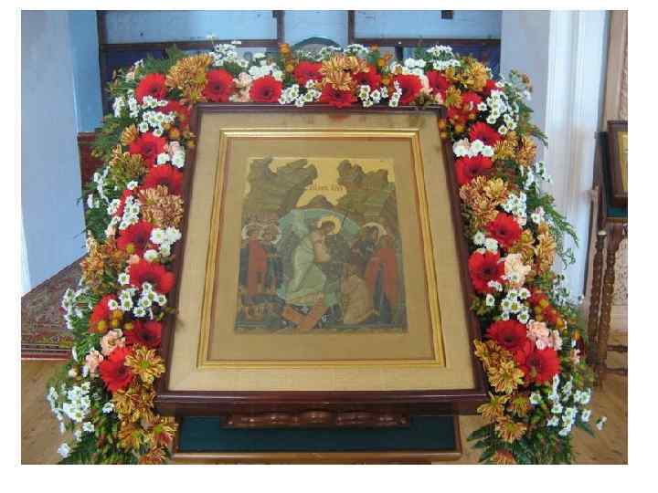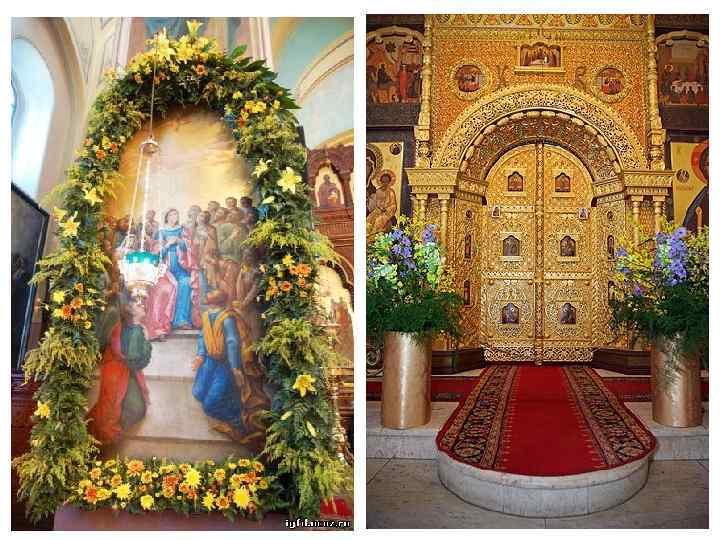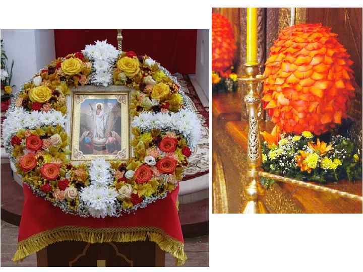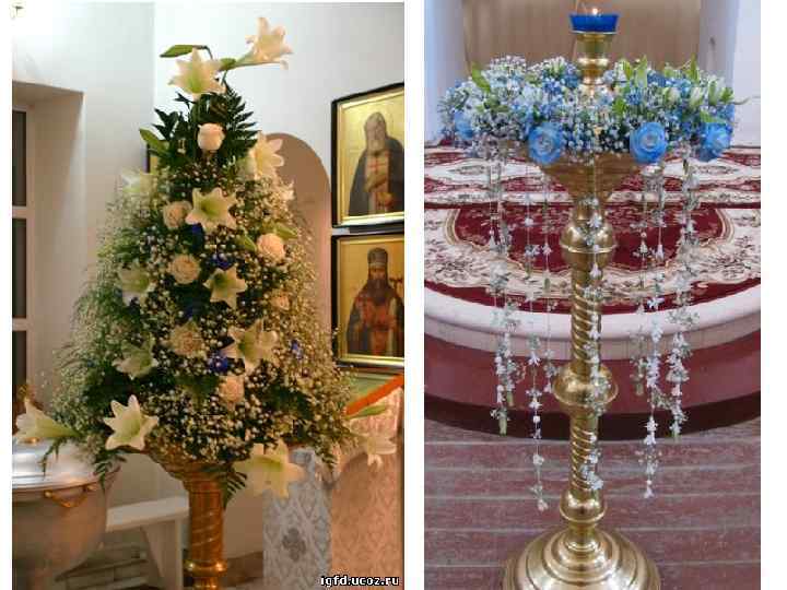 Каждый храм – не просто прекрасное архитектурное сооружение, а собрание видимых вещественных предметов, обозначающих мир невидимый и таинственный. В архитектуре православного храма и его убранстве нет ни одного случайного штриха: материал, орнаменты, сюжеты росписей, богослужебные предметы и облачение – все исполнено глубокого смысла. Поэтому цветочное оформление должно органично вписываться в интерьер храма, не доминируя, а лишь подчеркивая глубокий смысл богослужения. Для цветочного убранства в храме выбирают самые значимые и важные места. Царские врата, расположенные в центре иконостаса, оформляются цветочной гирляндой, композицией по двум сторонам. Украшается икона праздника, установленная на специальном возвышении – аналое. При этом важно, чтобы цветы гармонировали с окладом и иконой. Украшают престольную икону – святого или праздника, в честь которых освящен храм. Принято убирать цветами чтимые чудотворные иконы, раки с мощами святого, плащаницу, выносной крест и свечу. Подбор растений во многом связан с тем или иным сезоном, со своеобразием местности. Но есть и определенные традиции украшения церквей. Церковное убранство должно соответствовать облачениям священнослужителей, цвета которых глубоко символичны. Растения, используемые для украшения храма, должны гармонировать с основным цветом, присутствующим в тот или иной праздник.