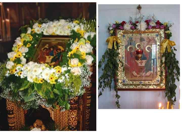 Праздникам, где прославляется непосредственно действие Святого Духа, - Дню Святой Троицы и Дню Святого Духа усвоен не голубой, как можно было бы ожидать, а зеленый цвет. Этот цвет образуется сочетанием голубого и желтого цветов, знаменующих Духа Святого и Бога Сына Иисуса Христа. Так, на Троицу (День святой Пятидесятницы) храмы и дома верующих бывают обильно украшены зелеными деревьями, травами и цветами. На Троицу все иконы в православных храмах красуются в убранстве зелени и всевозможных цветов, даже пол покрыт скошенной луговой травой. Зелень, цветы символизируют весну духовную, саму Церковь Христову, являются символом обновления, оживотворения. Благоухание цветов знаменует собой благоухание духовных даров, подающихся душам верующих Духом Истины, Господом Животворящим. В народе прочно утвердился благочестивый обычай весь год хранить троицкую зелень, прибегая к ее целебной помощи при недугах душевных и телесных.