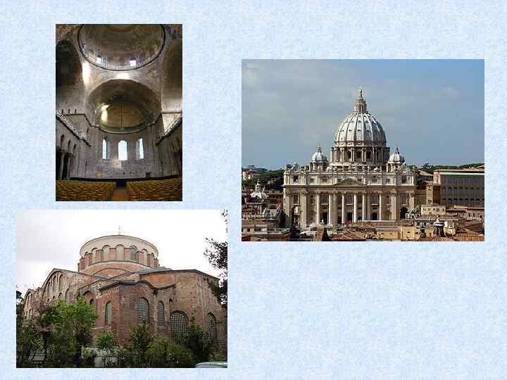 Христианские храмы • Основой христианского храма стала БАЗИЛИКА (от греч. – «царский дом» ) – вытянутое здание, продольно разделённое внутри рядами колонн на части, то есть нефы, число которых достигало 3 или 5.