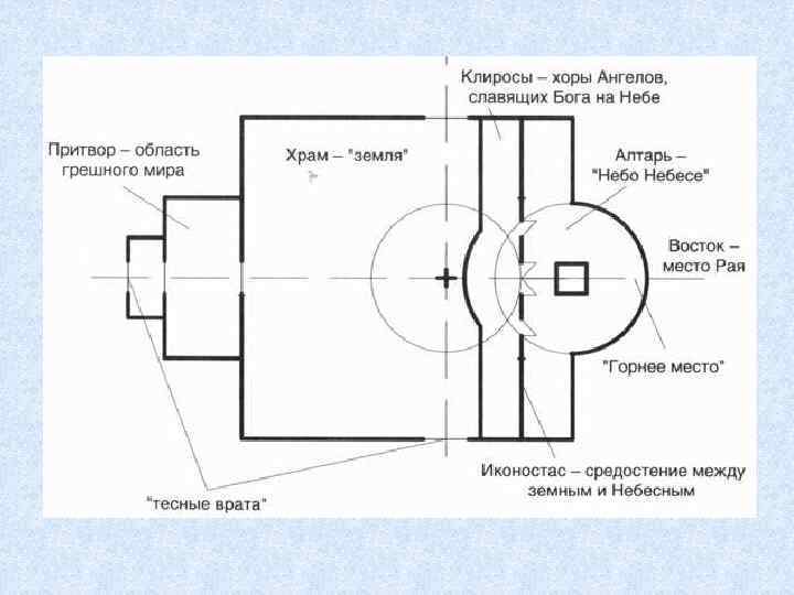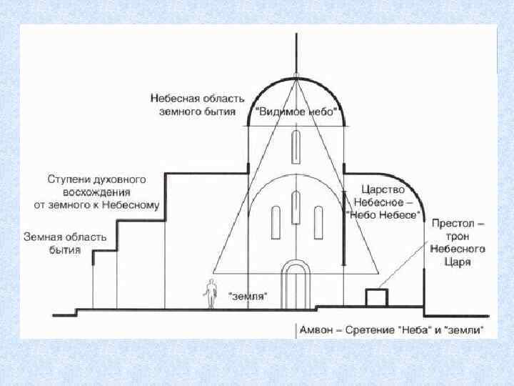 • Все храмы были строго ориентированы на восток, так как там находился Иерусалим – центр Земли. На востоке к основному прямоугольному объему примыкала полукруглая ниша – апсида с расположенным в ней алтарём – священной частью храма.