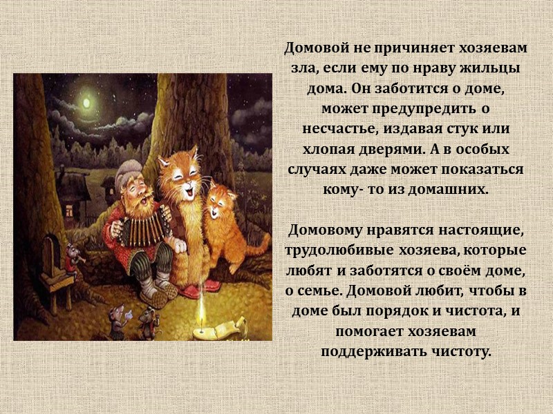 Домовой не причиняет хозяевам зла, если ему по нраву жильцы дома. Он заботится о доме, может предупредить о несчастье, издавая стук или хлопая дверями. А в особых случаях даже может показаться кому- то из домашних. Домовому нравятся настоящие, трудолюбивые хозяева, которые любят и заботятся о своём доме, о семье. Домовой любит, чтобы в доме был порядок и чистота, и помогает хозяевам поддерживать чистоту.