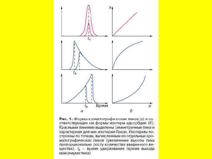 Газовая хроматография. Хотя первой появилась на свет жидкостная хроматография, первым хроматографом был газовый. То есть тот, в котором подвижной фазой был газ, а неподвижной — твердый адсорбент. Из-за этого конструкции жидкостного и газового хроматографов отличаются, но принципиальных различий нет. Газовая хроматография существует в двух видах – в первом случае неподвижная фаза сама является сорбентом, во втором случае она является инертным носителем очень вязкой и термически устойчивой жидкой фазы, которая и взаимодействует (абсорбирует их) с разделяемыми веществами. Механизмы хроматографического разделения и у газовой и у жидкостной хроматографии можно считать подобными. Вещества можно разделить тогда, когда их изотермы адсорбции на неподвижной фазе – адсорбенте – различны. В зависимости от вида изотерм различаются и формы выходящих пиков.