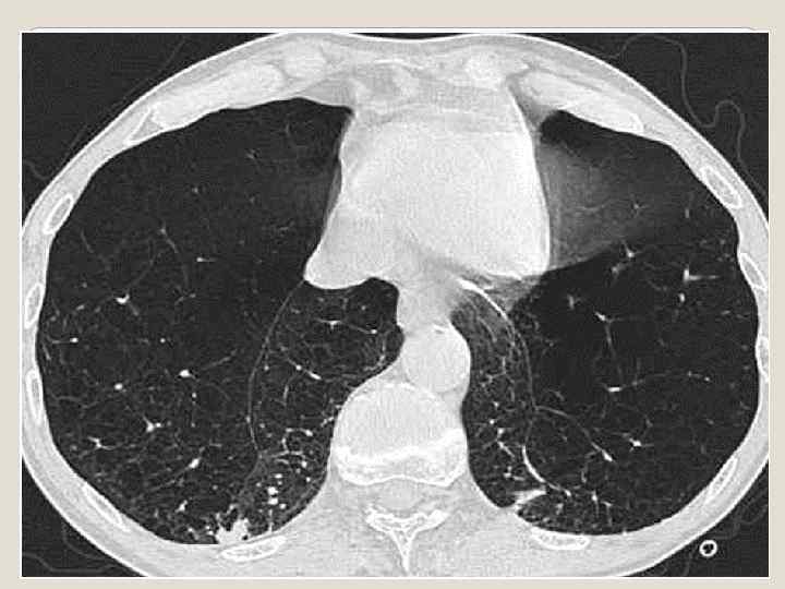 Компьютерная томография (КТ) грудной клетки не рекомендуется в рутинной практике. Однако если имеются сомнения в диагнозе ХОБЛ, КТвысокого разрешения может помочь провестидифференциальную диагностику. Кроме того, при рассмотрении вопроса о хирургическом вмешательстве, таком как операция уменьшения объема легкого, проведение КТ грудной клетки необходимо, поскольку распределение эмфиземы является одним из важнейших факторов, определяющих показания к операции