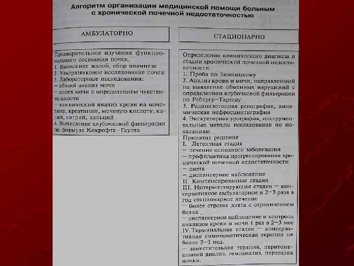 Показания к диализу подготовка больных с ХПН к трансплантации почки и другие больные с ХПН при ухудшении качества жизни. Большинству больных проводят диализ в течение 4 ч 3 раза в неделю и назначают диету, содержащую 40 60 г белка, с ограничением Na и К. К поддерживающей диете добавляют фосфатсвязывающие антациды, фолат и поливитамины.