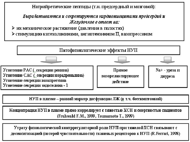 l В настоящее время полностью доказана тесная связь между тяжестью сердечной дисфункции (прежде всего ЛЖ) и содержанием натрий– уретических пептидов в плазме, что позволяет рекомендовать определение концентрации этих пептидов в качестве "лабораторного теста" ХСН. l В настоящее время наиболее полно охарактеризованы N–концевой предсердный натрий–уретический пептид (ПНП или ANP), мозговой натрий–уретический пептид (МНУП или BNP) и его предшественник - N–концевой МНУП (NT–pro BNP).