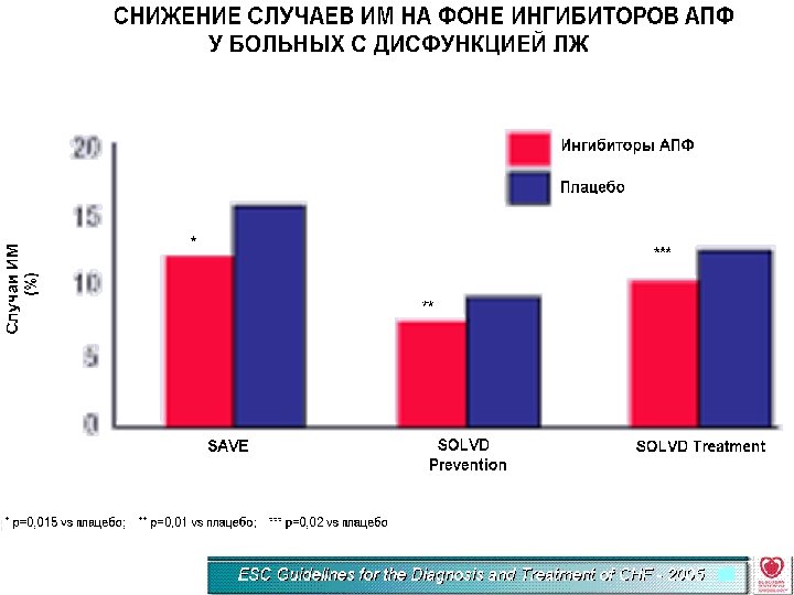 3. Асимптоматичные пациенты с документированной дисфункцией ЛЖ должны получать ИАПФ с целью замедления/предотвращения развития СН. ИАПФ снижают риск ИМ и внезапной смерти у таких больных (Класс I, уровень А). 4. При отсуствии задержки жидкости ИАПФ назначаются самостоятельно, при наличии отёков – в комбинации с диуретиками (Класс I, уровень В).