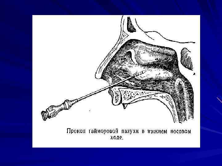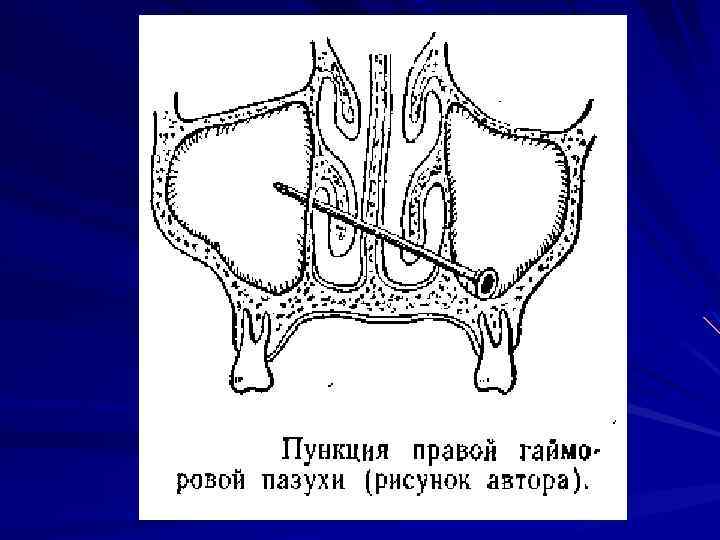 Осложнения пункции верхнечелюстной пазухи: 1. Кровотечение. 2. Щечная пункция (punctia bucalis). 3. Проникновение в глазницу. 4. Воздушная или жировая эмболия. 5. Коллапс (прекратить промывание, уложить больного, адреналин, кофеин, эфедрин, хлористый кальций в/в, преднизолон в/в, нашатырный спирт).